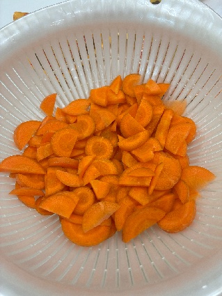 野菜を切り始めた子どもたち。薄く切るってどうするか…男の子たちは悩みます。ゴロゴロ動く人参との葛藤。(ひたすら輪切りを続け…無理〜!と)