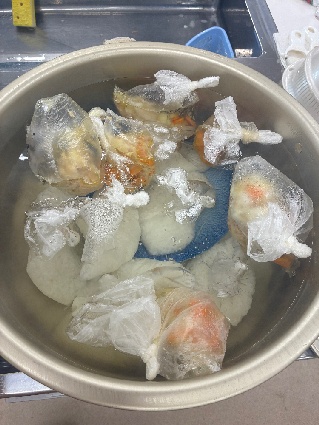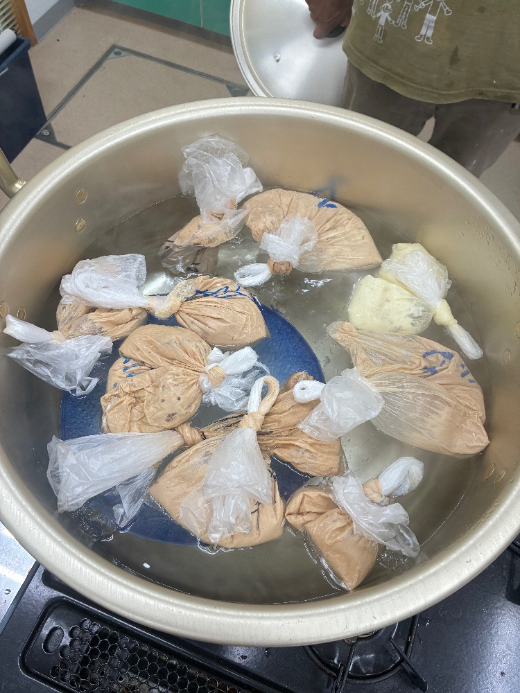 じゃがいも、玉ねぎは女の子たちとお母さんたちで切り進め、ツナ缶と共にそれぞれ袋に一掴みづつ分けていきます。みんな好きな物を多めに入れり、苦手な野菜は減らしたり😁My袋が出来上がったら沸いたお湯の中にドボン🙌🏻