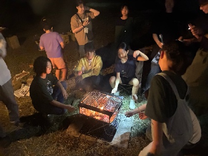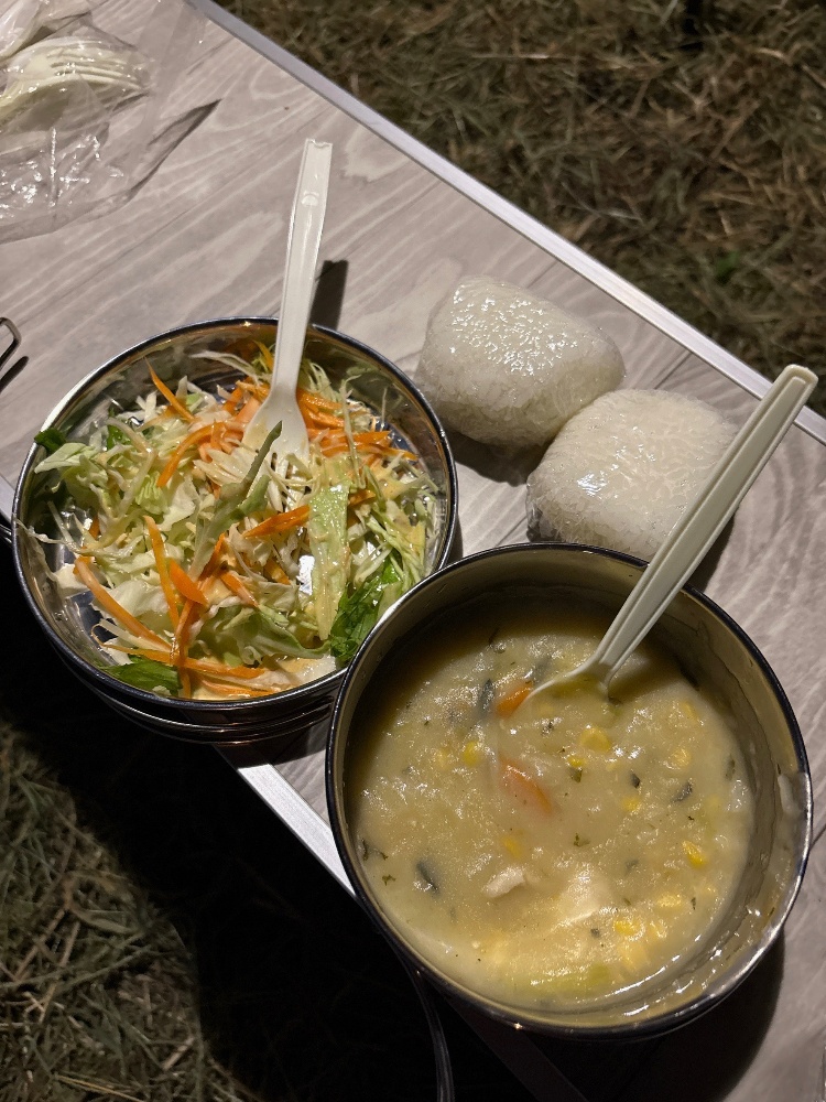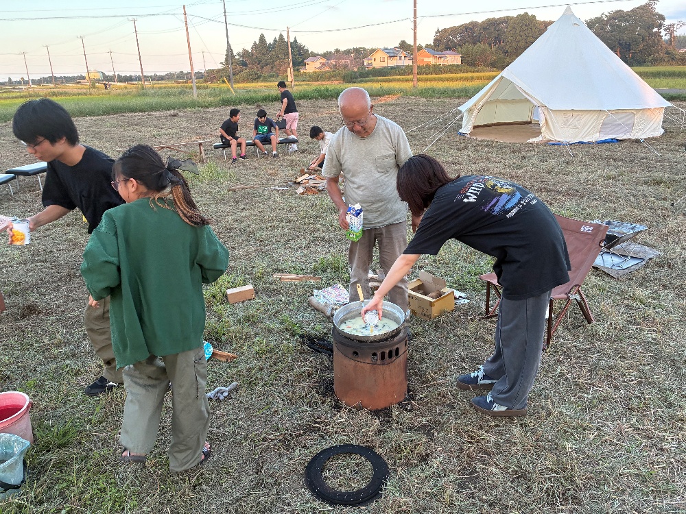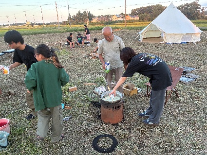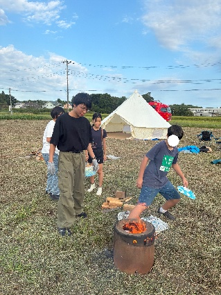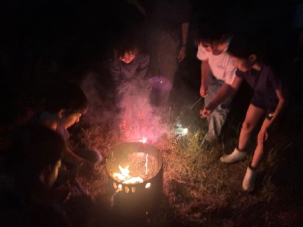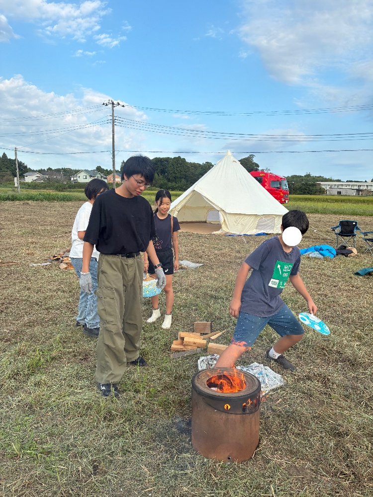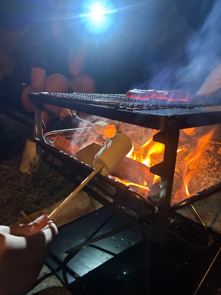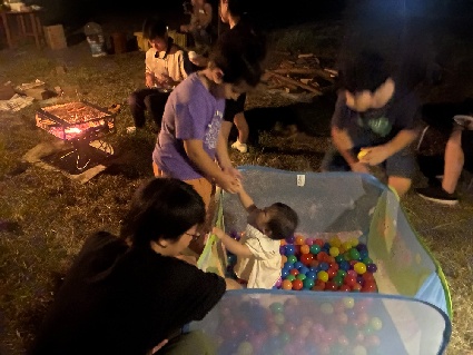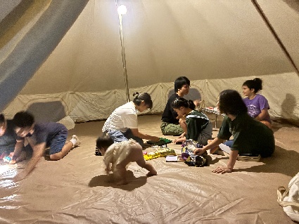 焚き火台の準備も完了し、みんなで囲みながらの夕食🍙焚き火台でソーセージやマシュマロを焼いたり、ゆったり読書を楽しんだり、テントの中で遊んだり、BGMに合わせてわいわい歌ったりと、子どもたちは自由に楽しくキャンプ気分を味わっていました